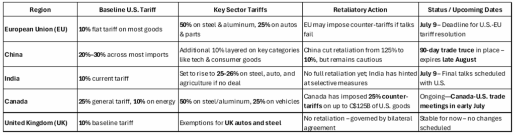 Tensions between Canada and the U.S. escalated in late June after Ottawa implemented a 3% Digital Services Tax (DST) on U.S. tech giants, retroactive to 2022. President Trump condemned the move, halted all trade talks, and threatened steep new tariffs. Canada responded with a 50% retaliatory tariff on excess U.S. steel imports. Just days later, in a strategic reversal, Canada announced it would suspend the DST, leading to a resumption of talks aimed at finalizing a trade agreement by July 21. The immediate goal is to avoid a snapback of U.S. tariffs currently paused until July 9. (Source: Reuters)