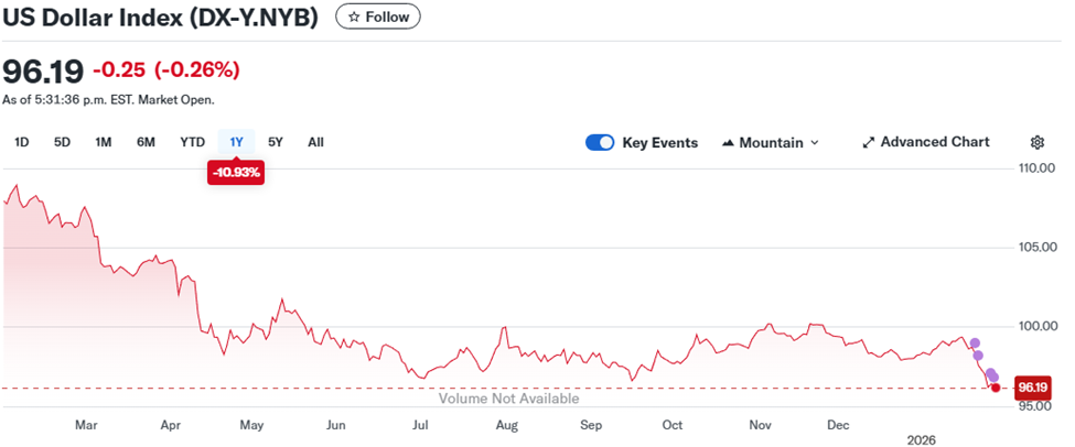 Another way to explain the run up in the price of gold may be pegged to the US dollar. When the U.S. dollar weakens, gold often becomes more attractive to buyers outside the United States because it effectively becomes “cheaper” in their local currencies. This can increase global demand and help support higher gold prices. When the dollar strengthens, the opposite tends to occur, as gold becomes more expensive for international buyers, which can temper demand. In fact, gold had a major pullback on Friday Jan 30th as USD strengthened against other currencies.