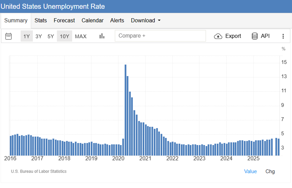 Central bank policy remains a central pillar of the market outlook. The Federal Reserve’s late January meeting resulted in no change to the federal funds target range, which remains at 3.50 to 3.75 percent. This decision marked a pause after a series of rate cuts late last year and reflected the Fed’s assessment that the U.S. economy continues to grow at a solid pace, inflation remains above the 2 percent target, and the labor market is stabilizing. The US unemployment rate edged down to 4.4% in December 2025, from a revised 4.5% in November, which had marked the highest level since October 2021. The reading also came in slightly below market expectations of 4.5%.