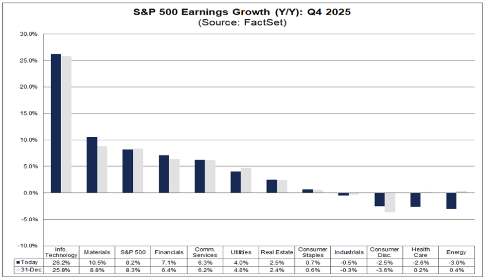 Against this macroeconomic and policy backdrop, corporate earnings have provided a constructive, if uneven, foundation for market confidence. In the United States, fourth-quarter reporting is tracking toward approximately 15 percent year-over-year earnings growth on about 8 percent higher revenues, according to FactSet. This performance reflects another quarter of solid profitability for the S&P 500, with technology and materials sectors leading the upside. Companies tied to artificial intelligence, automation, and industrial investment have frequently exceeded expectations, highlighting the continued strength of capital spending and innovation-driven demand.